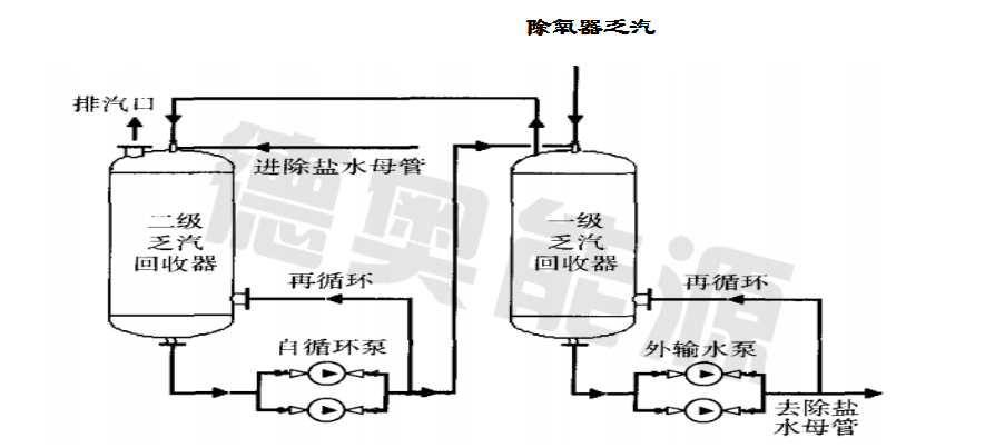 乏汽回收按乏汽的排放壓力和乏汽的成份可分為:有壓潔凈乏汽回收、有壓含不凝氣乏汽回收、有壓污染乏汽回收、無壓潔凈乏汽回收、無壓含不凝氣乏汽回收和無壓污染乏汽回收。除氧器乏汽為含有氣體雜質的無壓廢汽,排放壓力很低,輸送能力很差,無法直接利用。